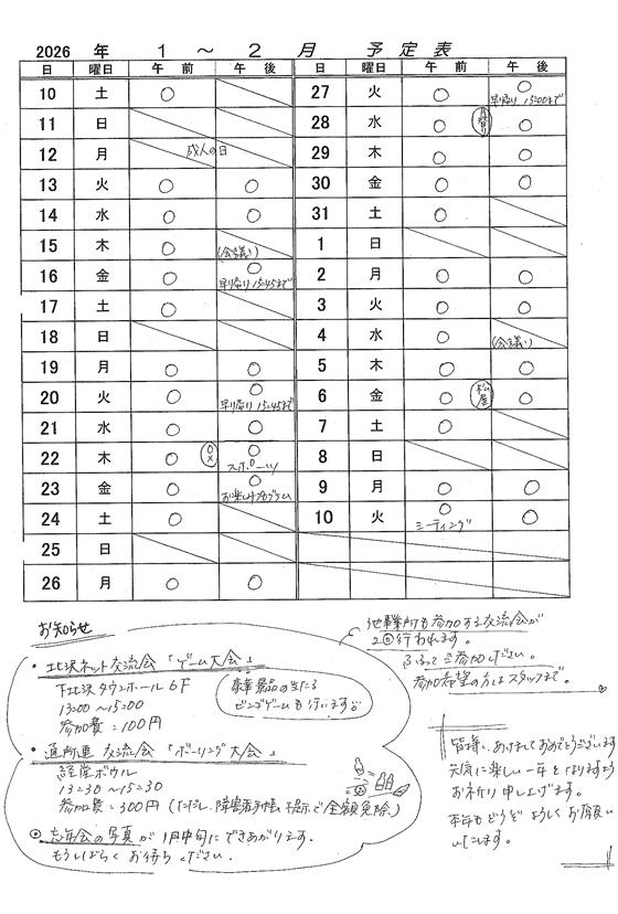 ★1~2月の予定表をアップしました 〇……通常通りに通所している日です ×……閉所している日です。 ミーティング……全体でミーティングを行う日です。 ※現在、コロナウィルス感染予防対策としてボランティアの受け入れを一時的に中止しております。ご迷惑をおかけしておりますが受け入れ可能となり次第お知らせいたしますので何卒よろしくお願いいたします。